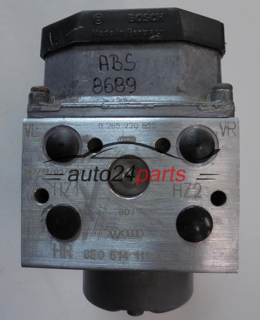 The number 0265220525 refers to the hydraulic part of the ABS pump manufactured by Bosch, while 8E0614111AH is the catalog number used by the vehicle manufacturer. Both designations may refer to the same ABS module working with control unit 0273004358.